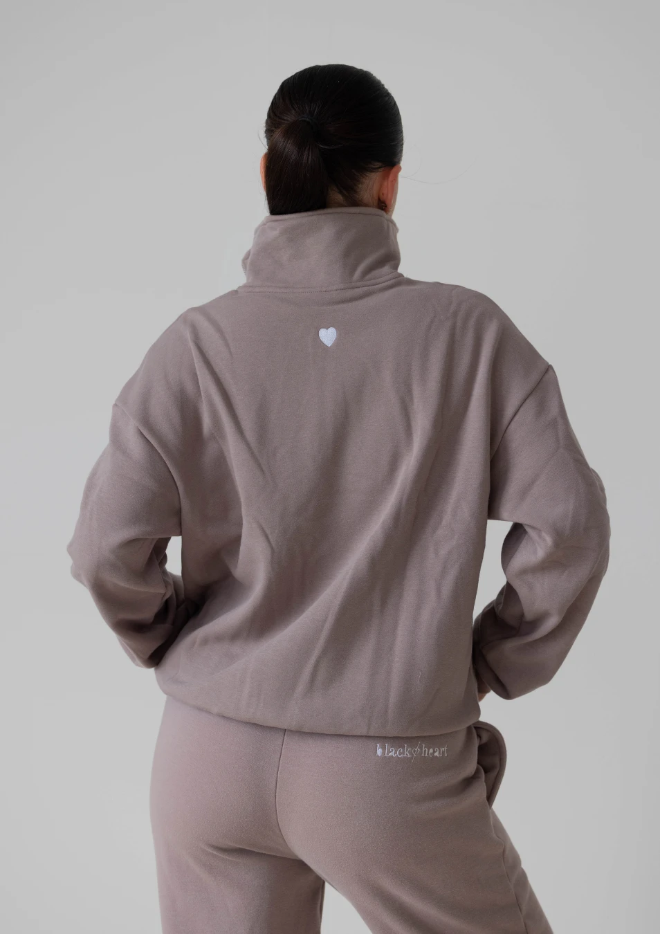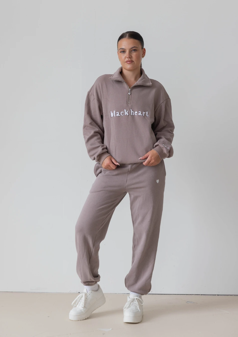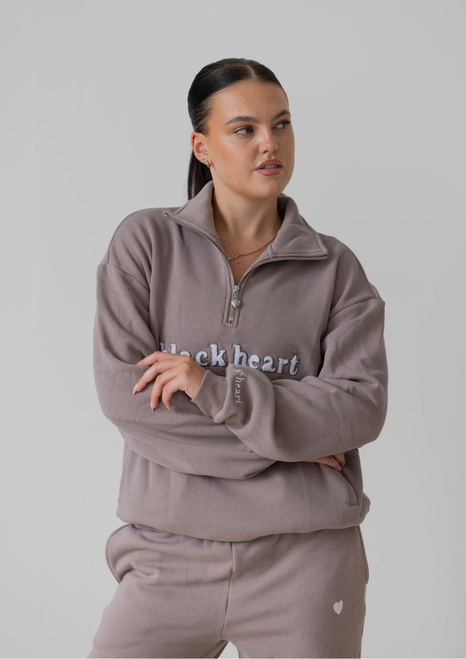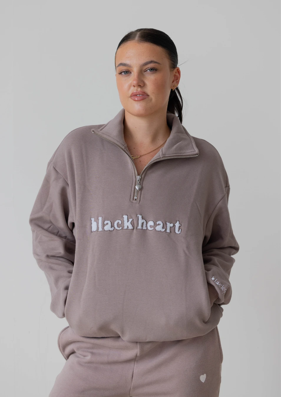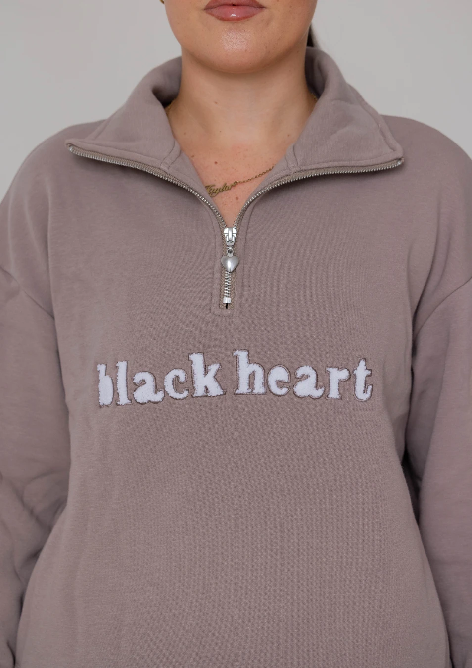 Black Heart logo in white teddy embroidery on the front and metal heart zipper pull.