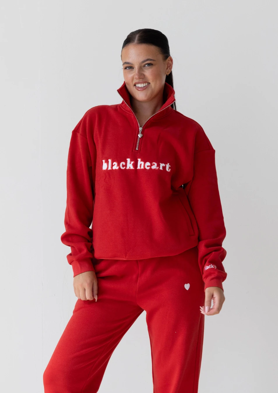Black Heart logo in pink teddy embroidery on the front and metal heart zipper pull.